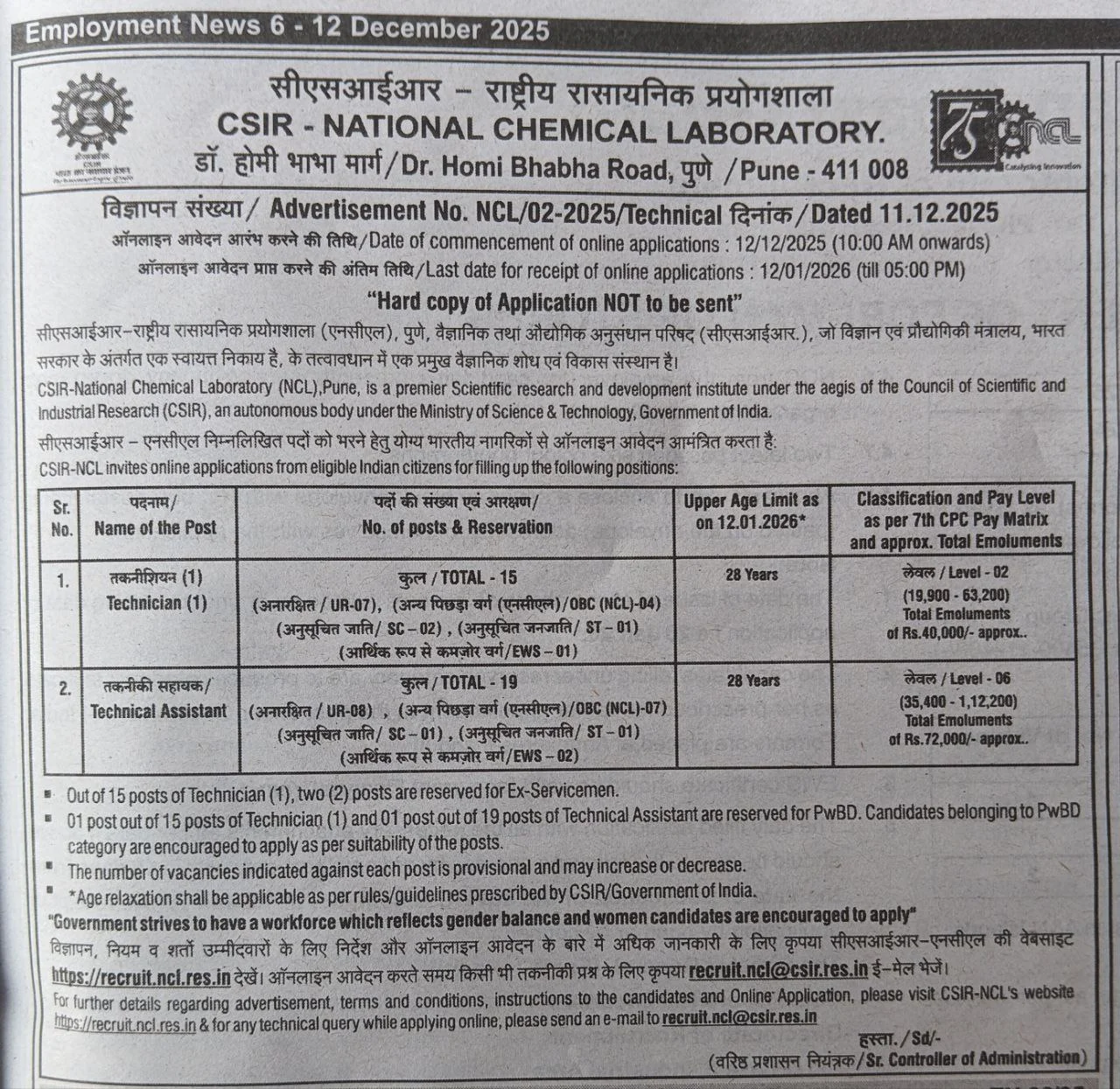 CSIR NCL Recruitment 2025 is a great opportunity for candidates looking for a stable government job in the scientific sector. The CSIR – National Chemical Laboratory (NCL), Pune, has officially released a short notification inviting online applications for the posts of Technician (1) and Technical Assistant. A total of 34 vacancies have been announced. The online application process is set to begin on December 12, 2025, and candidates can apply until January 12, 2026. This recruitment drive offers excellent salary packages under Pay Level 02 and Level 06. Read the full article below for accurate details on dates, eligibility, and the application process.